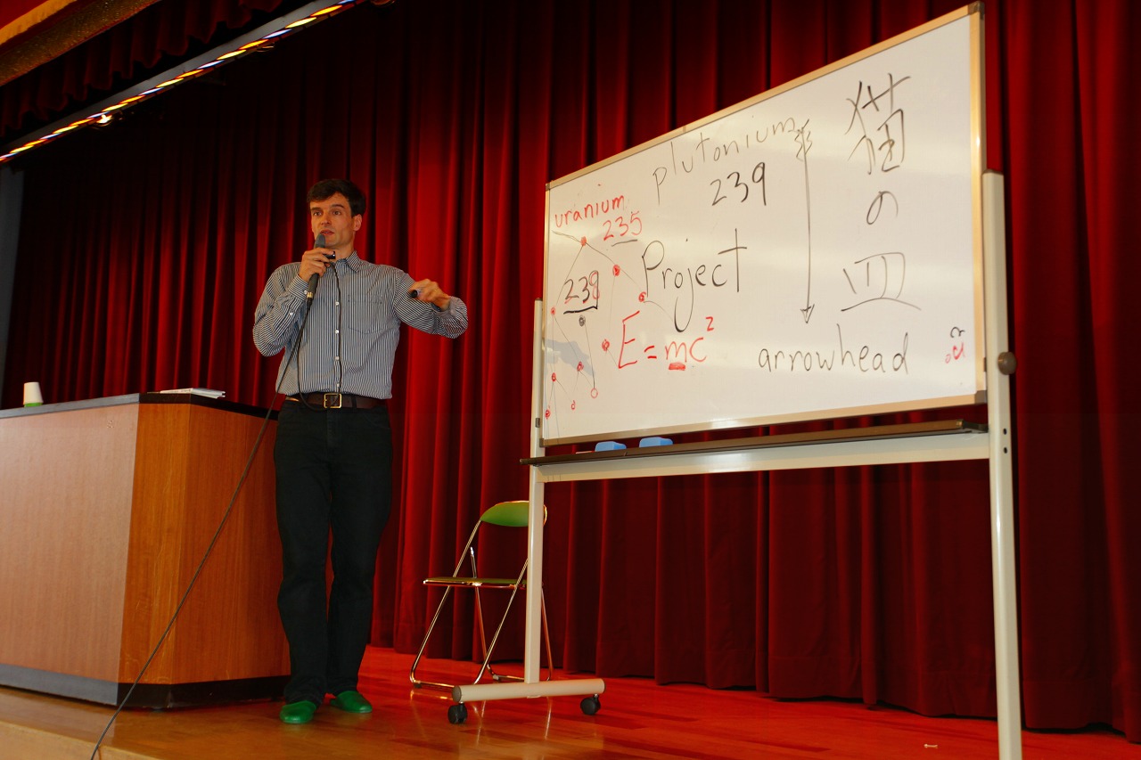 | | 核爆弾を作る「マンハッタン計画」 | | まず昨年の福島原発事故に触れ「ばらまかれた放射性物質は、どうにも付き合えない有害な物質」と指摘、原子力の歴史について、「1940年代、アメリカで核爆弾を作るための『マンハッタン計画』が本格化し、それまでの兵器とは次元の違う原爆作りが始まった。 大戦中に始まった計画は、憲法に違反する形で税金がつぎ込まれ、最初から法律順守・説明責任という発想はなかった。 戦後も核開発を続けるため『原爆は戦争を早く終わらせた』『ソ連は恐いぞ』と国民をだまし続け、1940年代終わりには水爆作りも始まった」と語りました。